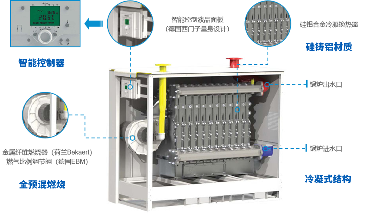 歐洲整機(jī)原裝進(jìn)口,硅鋁合金換熱器,抗腐蝕性強(qiáng),壽命有保證,德國SIEMENS控制器,命令Ⅲ級輸出,檢測輸出信號,執(zhí)行過程更有11重安全保護(hù),確保燃燒工況,安全無隱患,更有15~100%無極變頻調(diào)節(jié)功能,提高使用體驗。